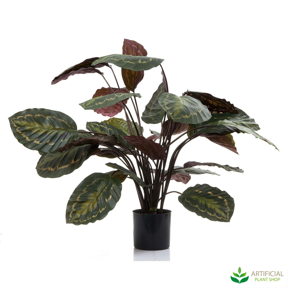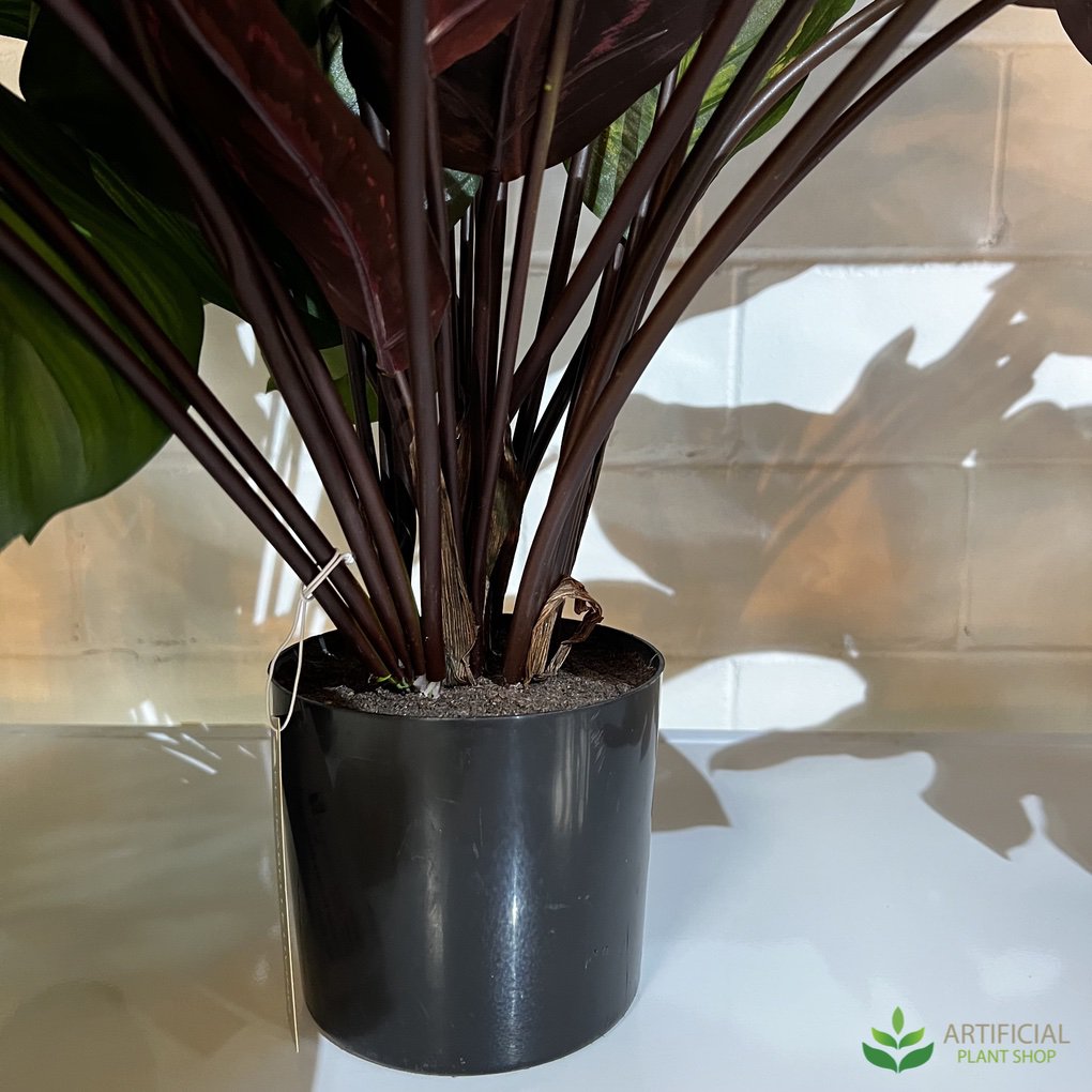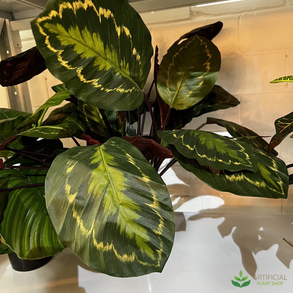The Calathea is a favourite house plant because of its unique, striking and patterned foliage. Its lovely red and green leaf colour combinations will always stay vibrant and eye-catching no matter what the weather conditions are! To complement the unique veining of this artificial calathea, it is seated in our standard black pot.