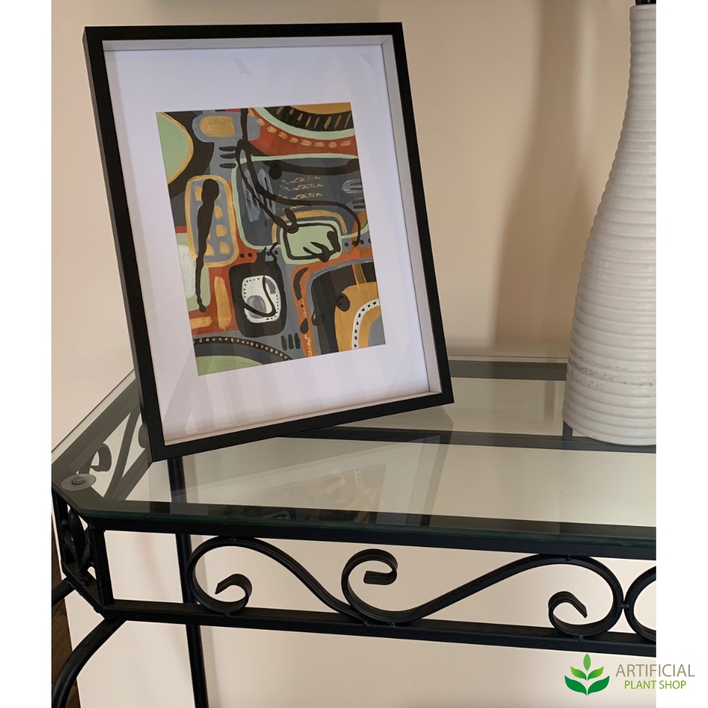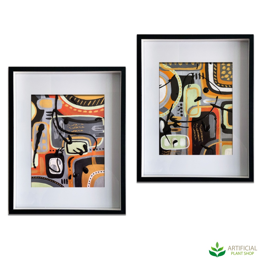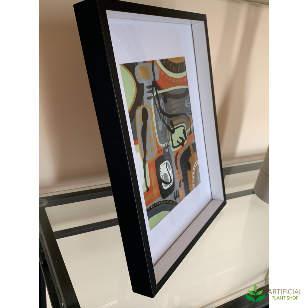 The colour scheme consists of black, orange grey, gold, and pastel green. The gold has a shimmer in various lights, and the black frame creates a really modern appeal. It is a more bold colour scheme than the rest of my Chaos in Colour series which makes it very versatile as it suits most interior spaces, particularly due to the sophisticated black box frame.