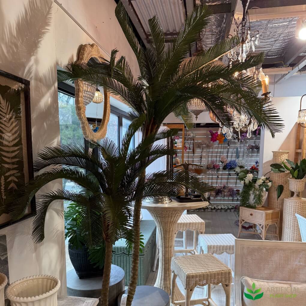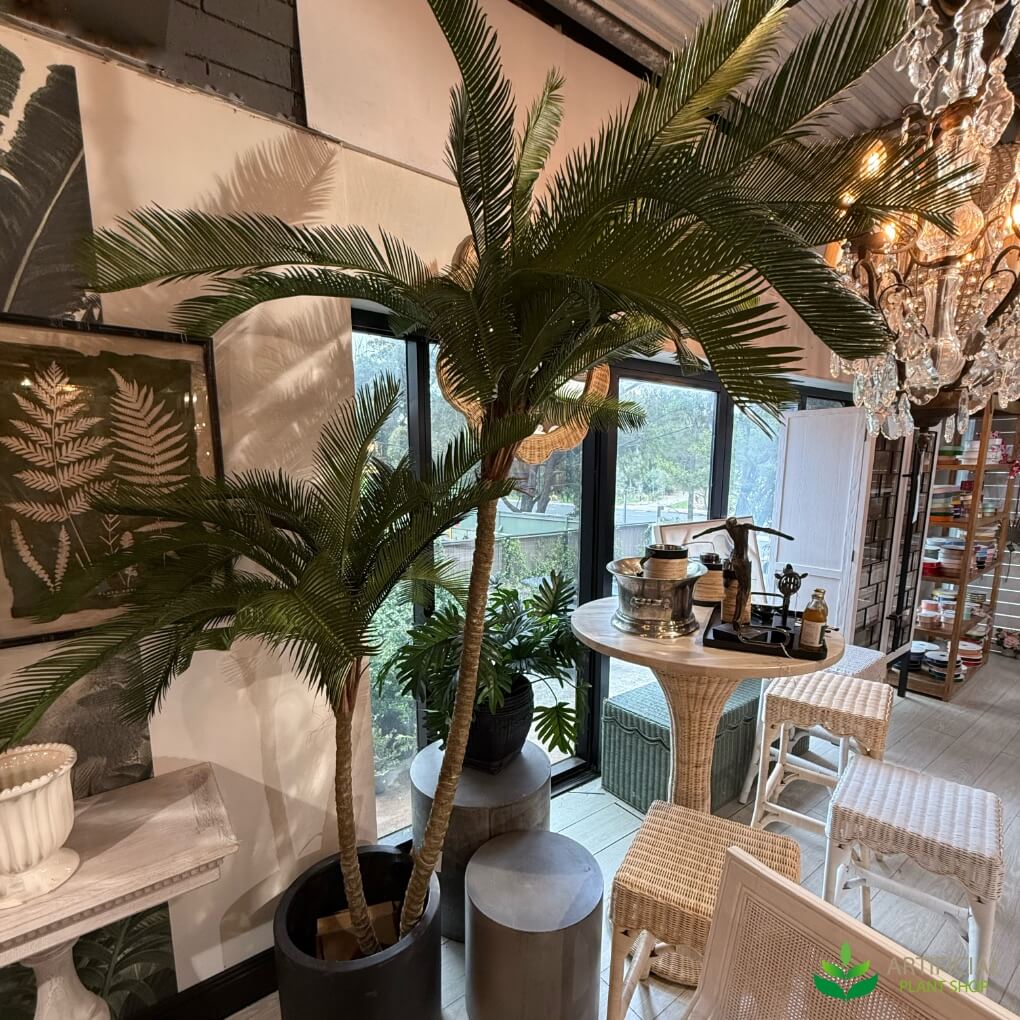 Get double the tree with this Cycad Palm. Featuring two trunks, each with a Palm Tree canopy at the top - it looks like something you’d find on a tropical island paradise. Look closely at the base of the canopies and you’ll notice real bark and palm tree husk, exactly like you find on a real palm. The leaves are incredibly detailed, making this a ultra lifelike Palm Tree. Standing a towering 2.2 metres tall and 1.5 metres wide, this is perfect for large spaces. Add some smaller palms and you’ve got yourself a tropical paradise!