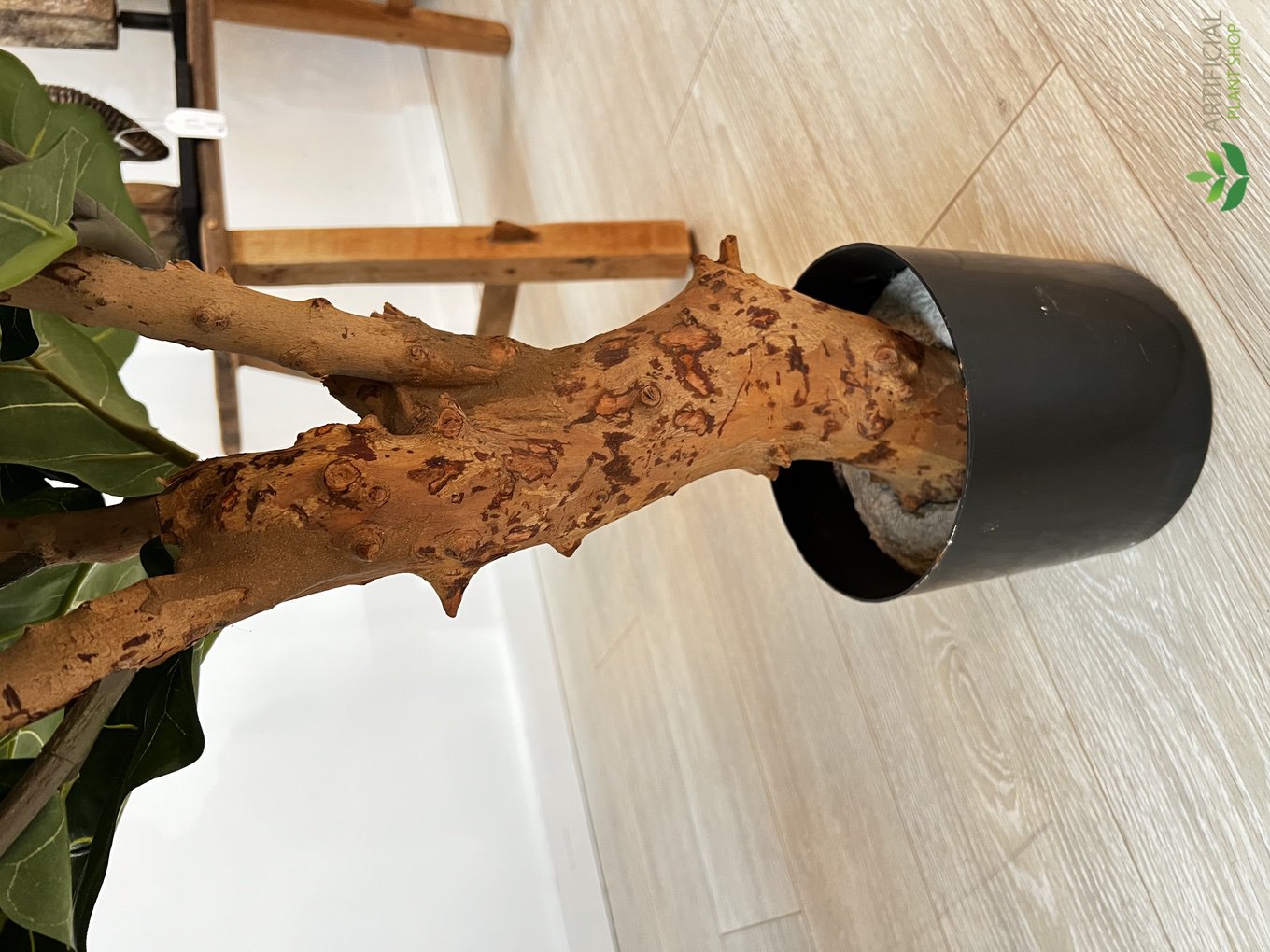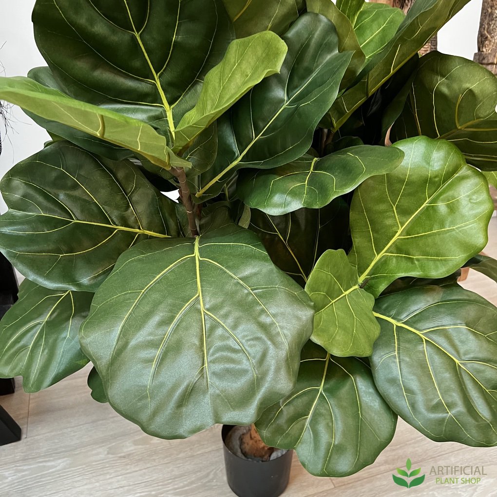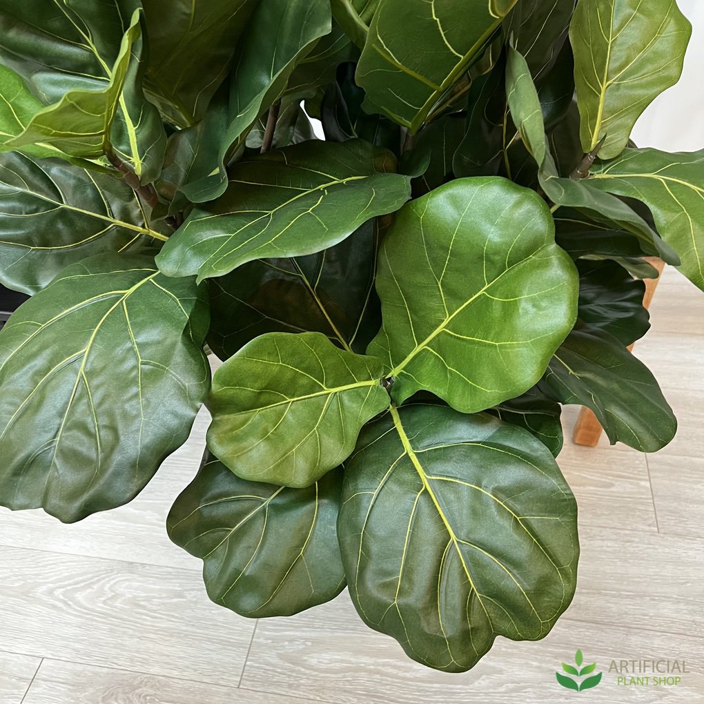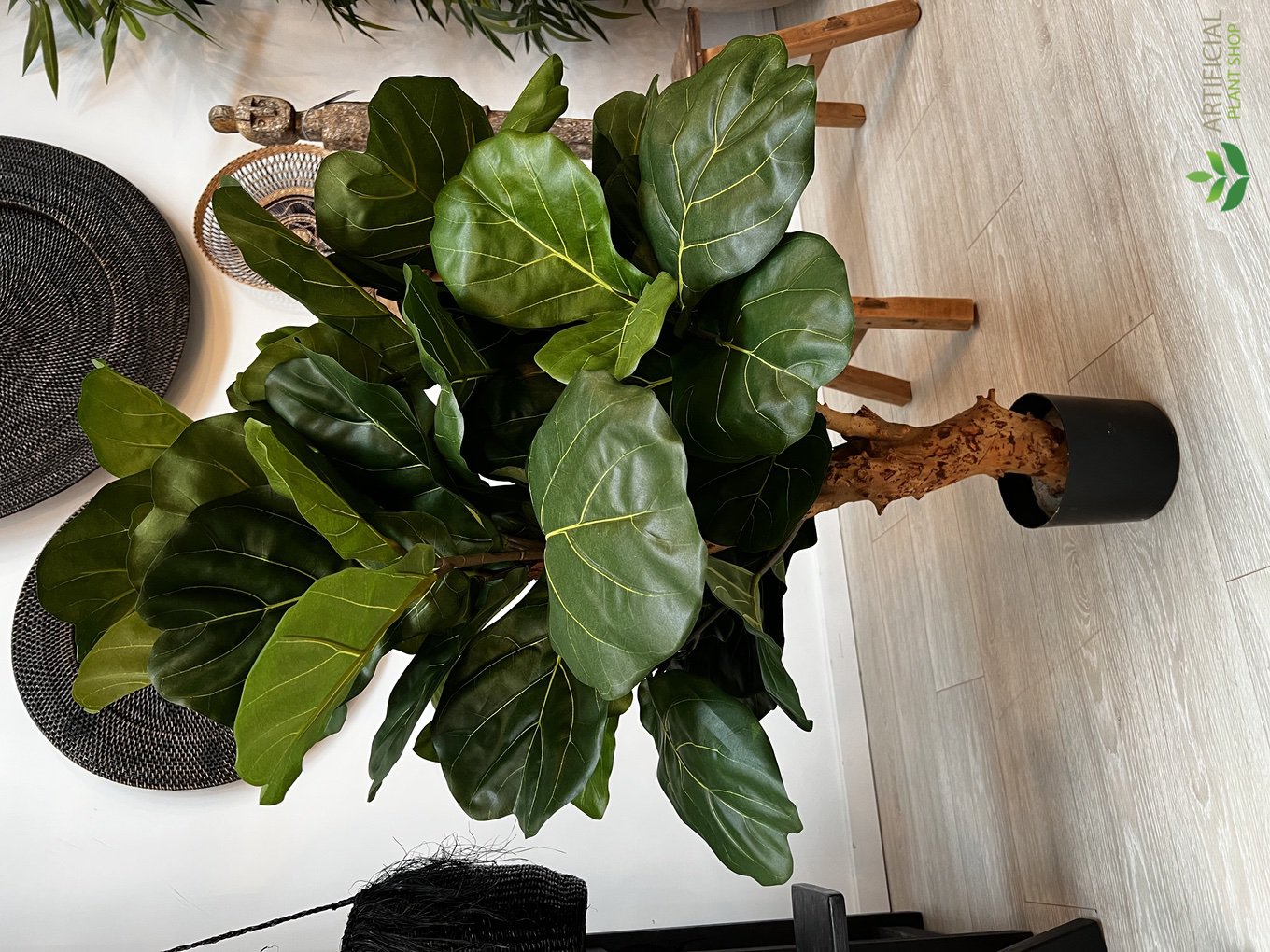 Unlike most fiddle leaf trees that are tall and slender, this fiddle leaf has more of a bush shape. Standing 1.2 m high and approximately 80 cm wide it has lots of lush green foliage, so it looks exactly like a real Fiddle Leaf! The trunk on this tree is thick and made of real timber, giving you all the natural texture of a real tree. As with all our fiddle leaf trees you’ll notice the leaves are slightly different shades of green, making them look much more lifelike. The leaves are large and wide so overall this is a really lush full looking Fiddle Leaf. This particular product is our favourite fiddle leaf, right beside the two meter version we offer.