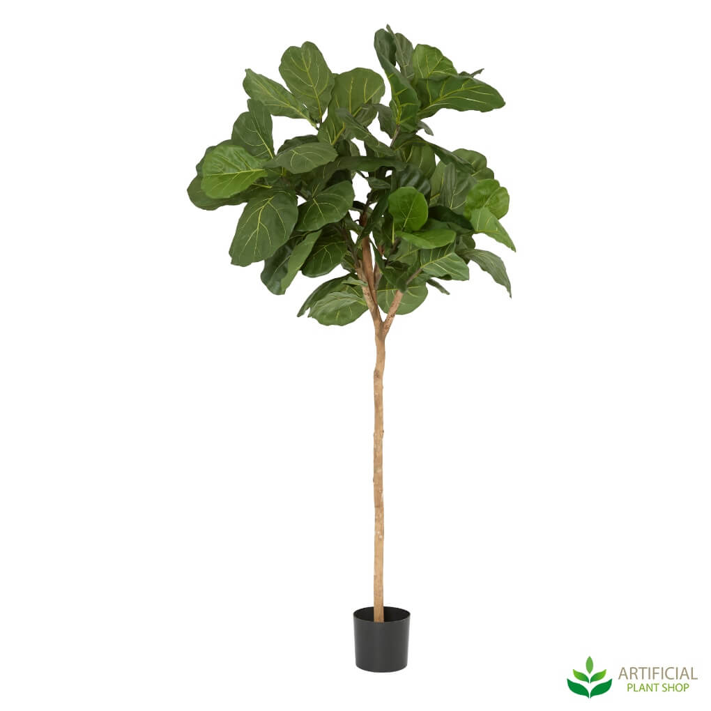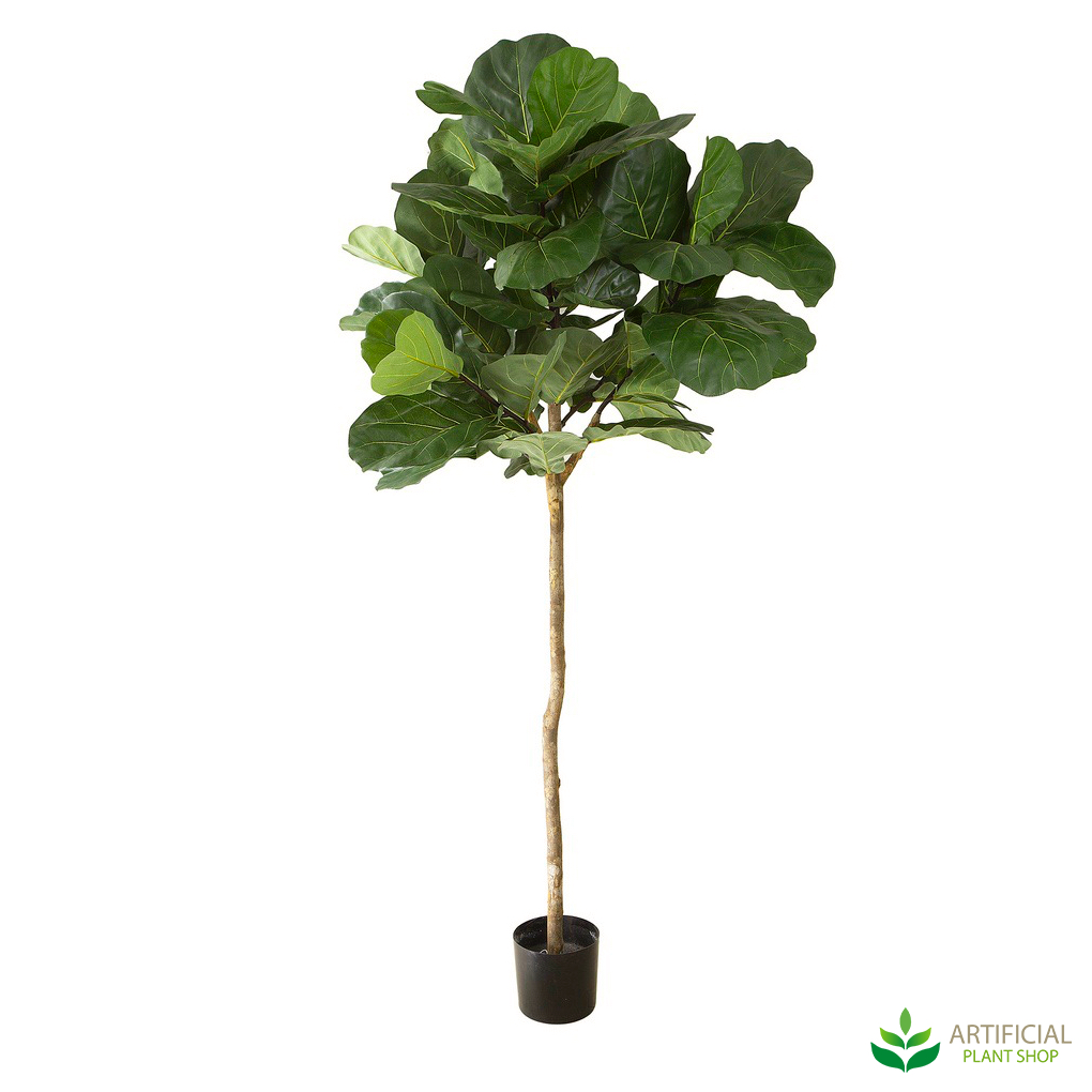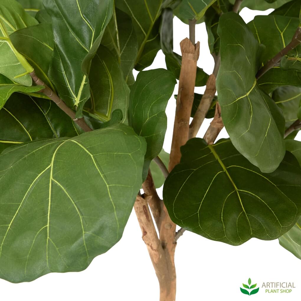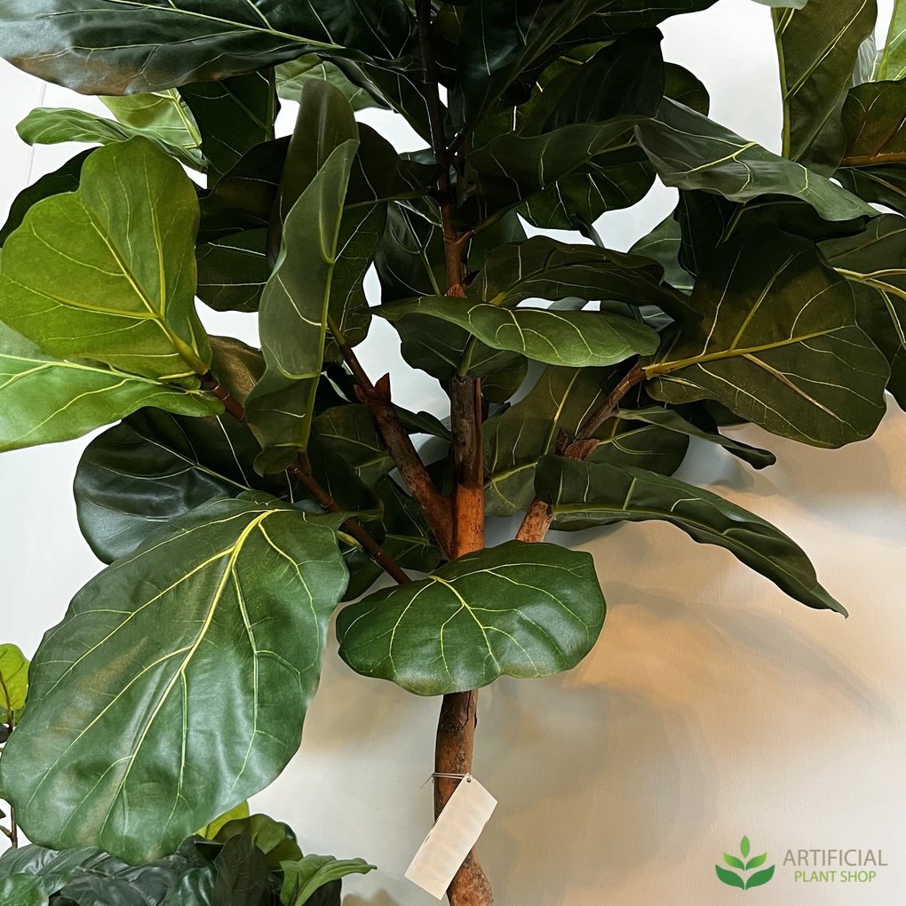This is one of the tallest Fiddle Leaf trees we offer here at the Artificial Plant Shop. It measures 2.1 metres tall and approximately 60 cm wide. What makes this tree different to many of the others is that it has more of a topiary shape, rather than a full tree with foliage from top to bottom. At the base you’ll notice our standard black pot which the tree comes in and then a long natural timber trunk spanning the majority of its height. This is a great option to use in areas where you want a nice lush tree at the top but don’t have enough space down low to accommodate the foliage. The leaves on this faux Fiddle Leaf Tree are large, lush and also made to incorporate different shades of green for an ultra natural appearance. On each leaf you'll notice very intricate detailing showing veins just as you see on a real tree.