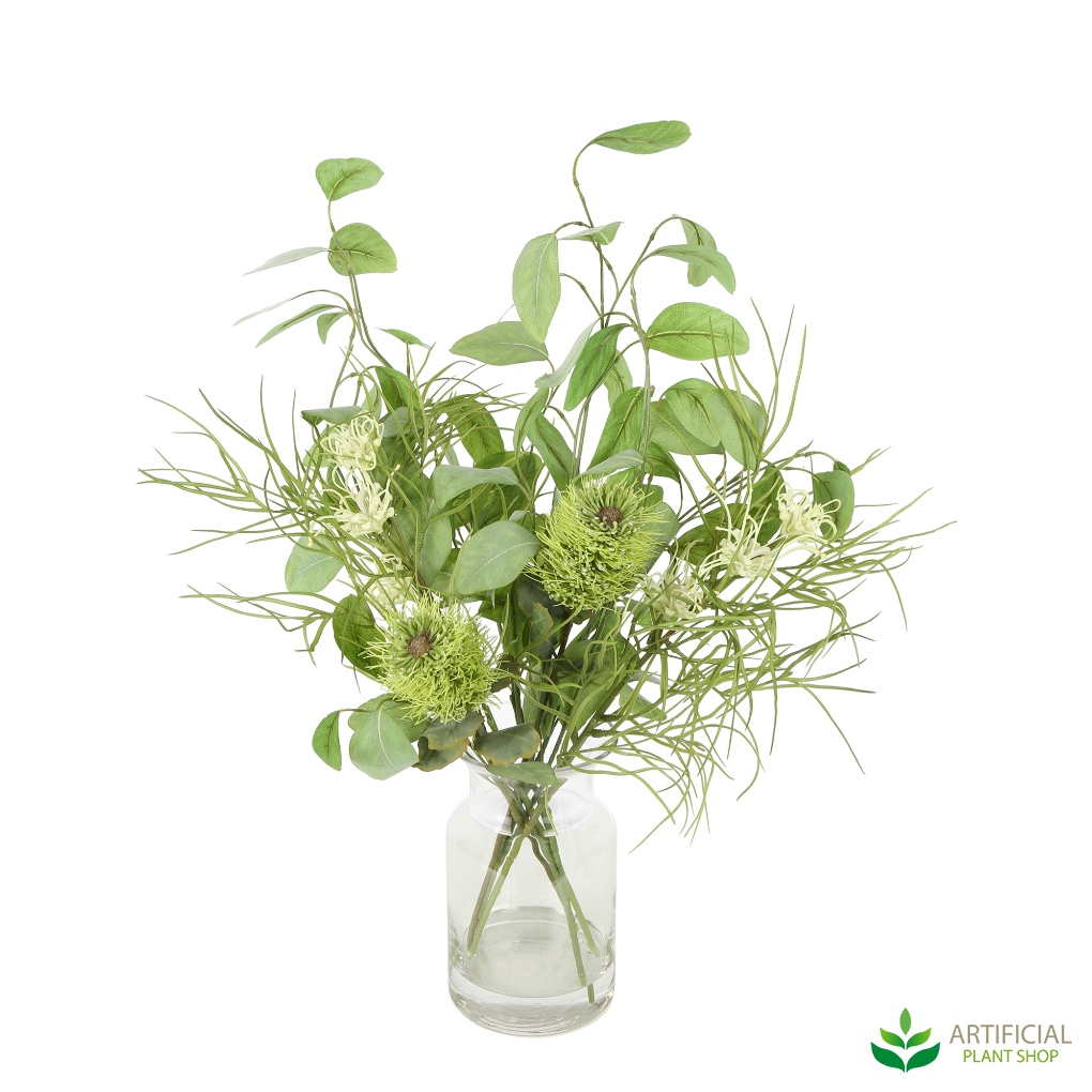 Want to feel like you're on a bushwalk without leaving home? Check out our 69cm Green Native Arrangement. This arrangement is a wonderful blend of various native flora, all intertwined in a natural, delightful display. It's taller than most arrangements, making it a superb choice for floor placement or as a dining room showpiece. The varied shades of green create a mosaic of natural beauty that can liven up any room in your home or office. And, of course, there's zero upkeep needed, so it'll stay as fresh as the day you brought it home.