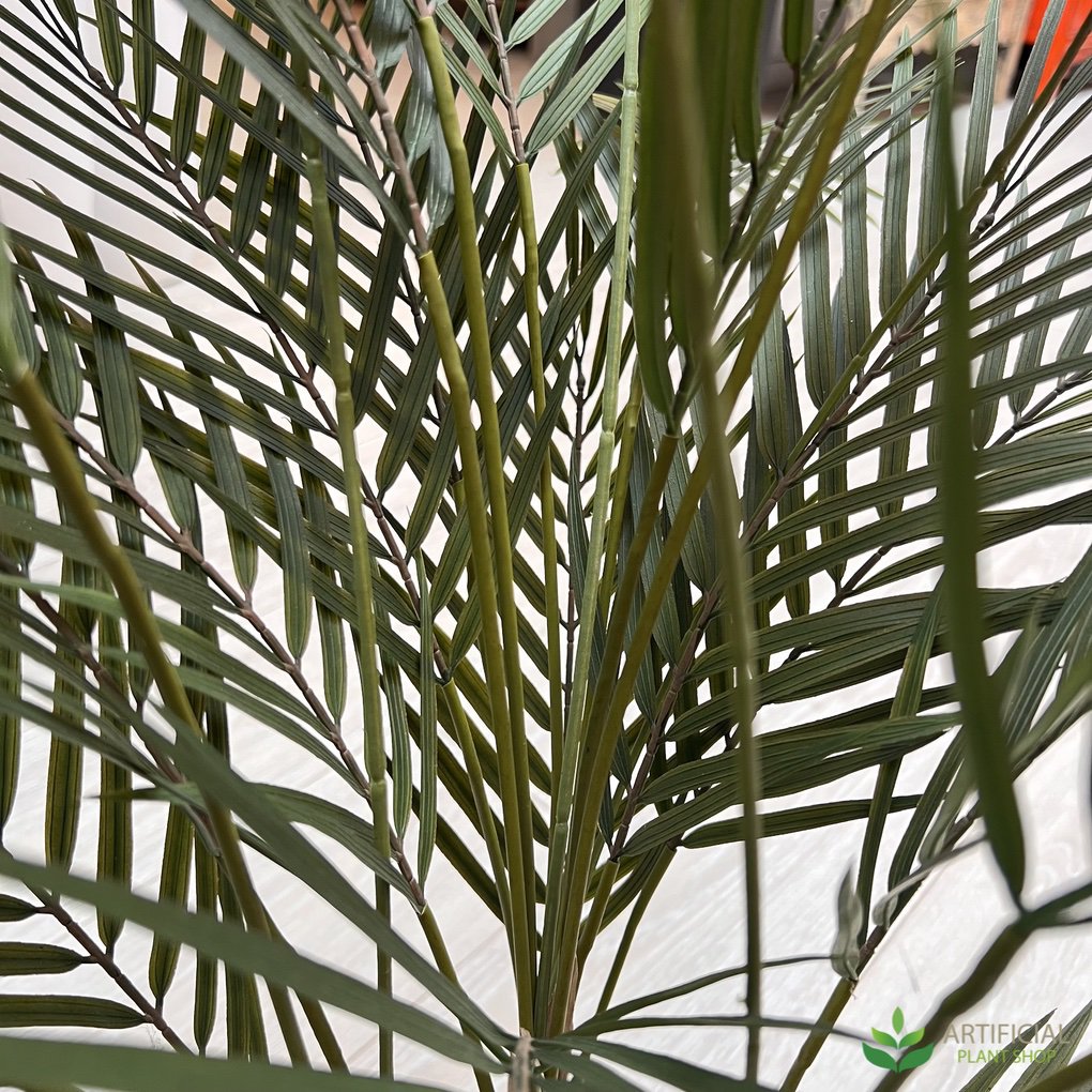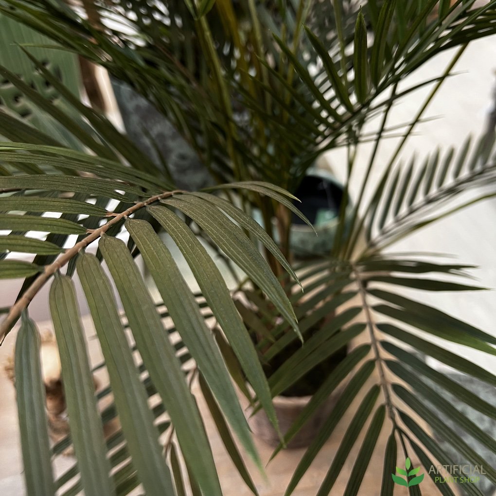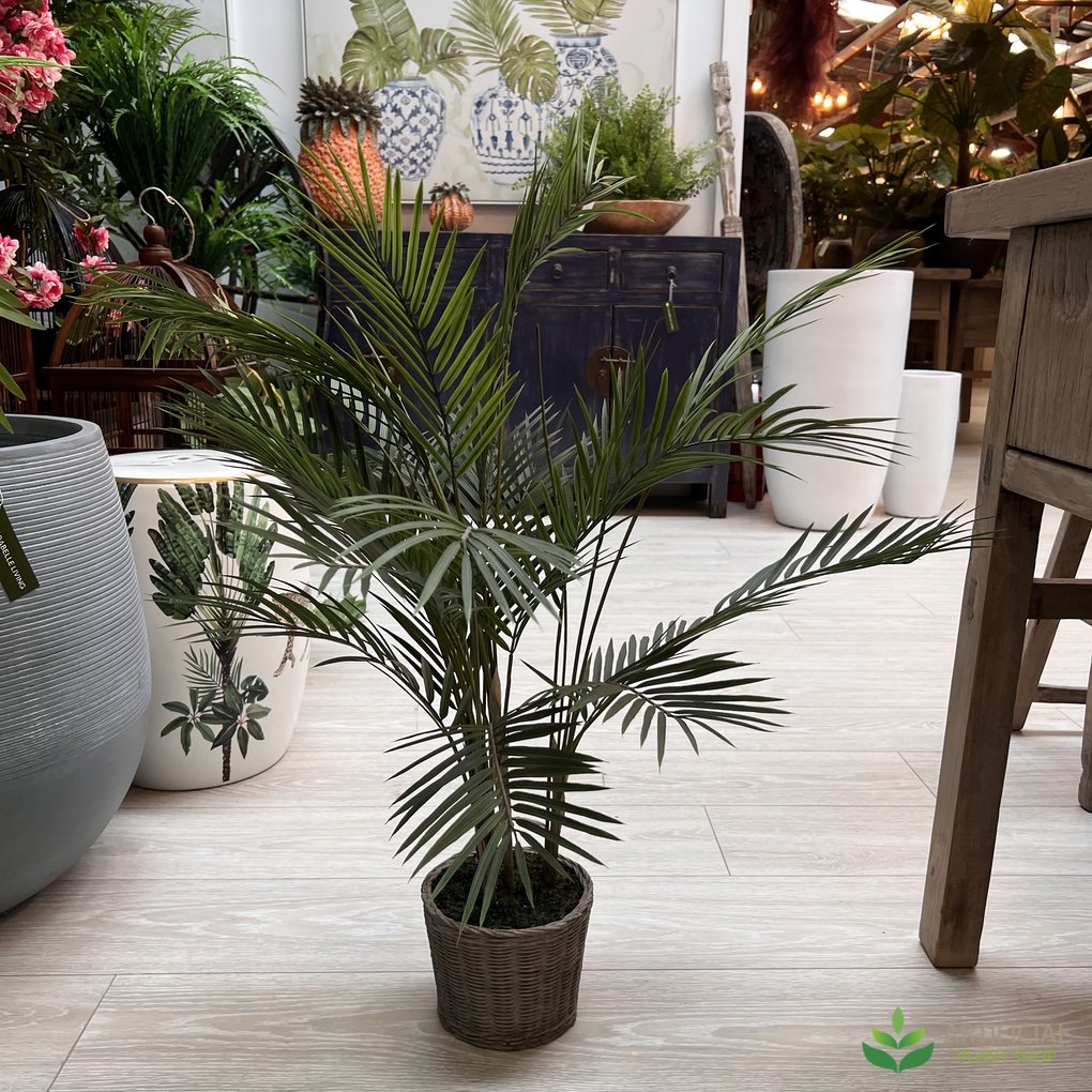 This unique artificial Palm brings a little bit of the tropics indoors. It is extremely realistic looking with each of the three stems branching out to healthy, slender palm leaves. The woody stems emerge from a pot which has a textured, rattan appearance. Each palm leaf has an even spread and very in shades of green. The leaves are also slightly mouldable so can be adjusted if necessary. It also is very lush around the centre. This palm measures 90cm high, therefore can be used as a great addition to a lounge or office area, or even as a subtle screen to divide an area if multiple ferns were placed side by side.