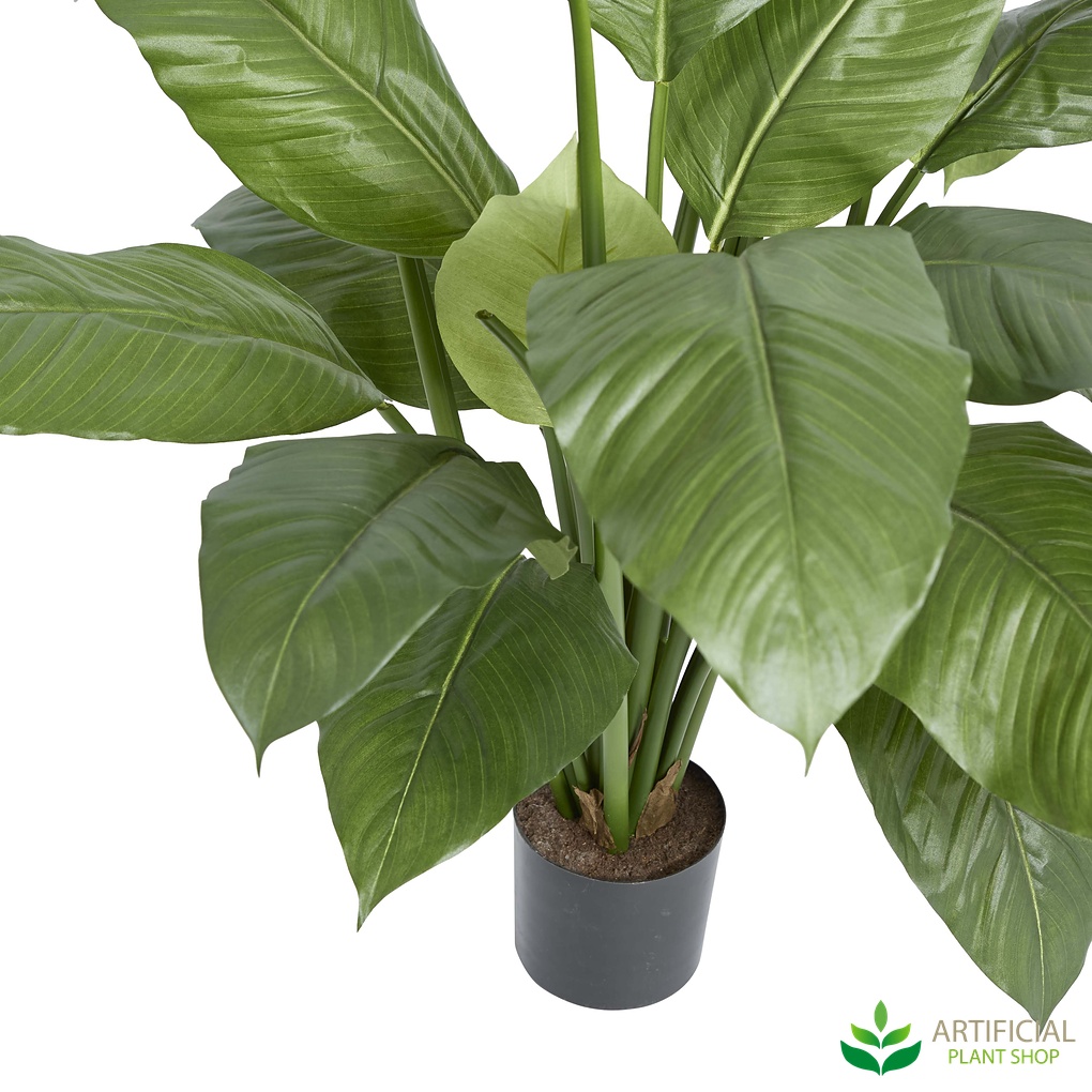 This is our largest Spathiphyllum, standing 1 metre tall. If you're looking for something to add some greenery to your home, office or cafe space, this is perfect. With lush and true-to-life green leaves it's hard to tell it's a fake plant! Lots of attention to detail has been given to these plants, from the leaf shape, detailing and overall stem placement so you get a nice natural coverage of leaves from top to bottom.