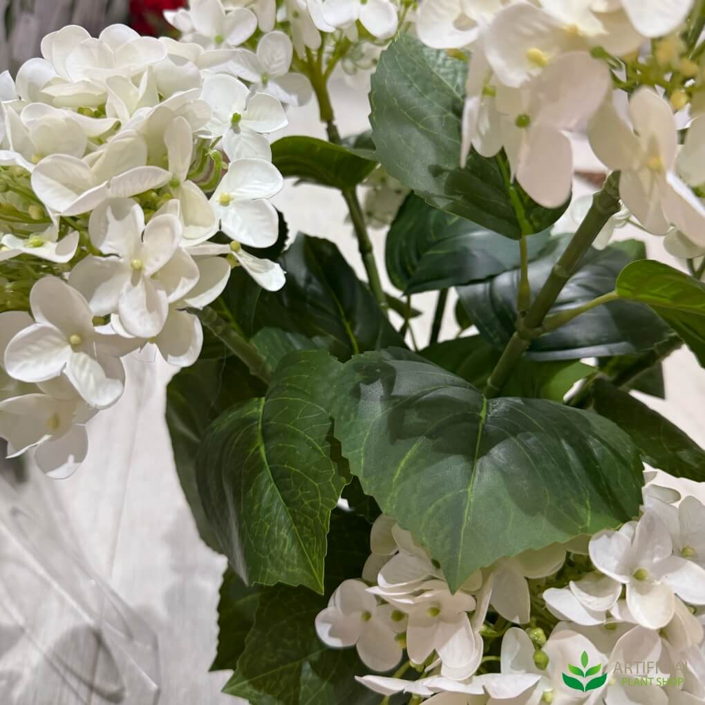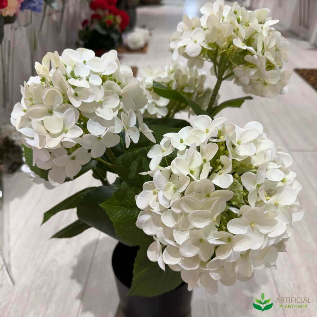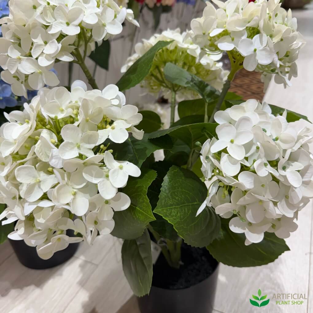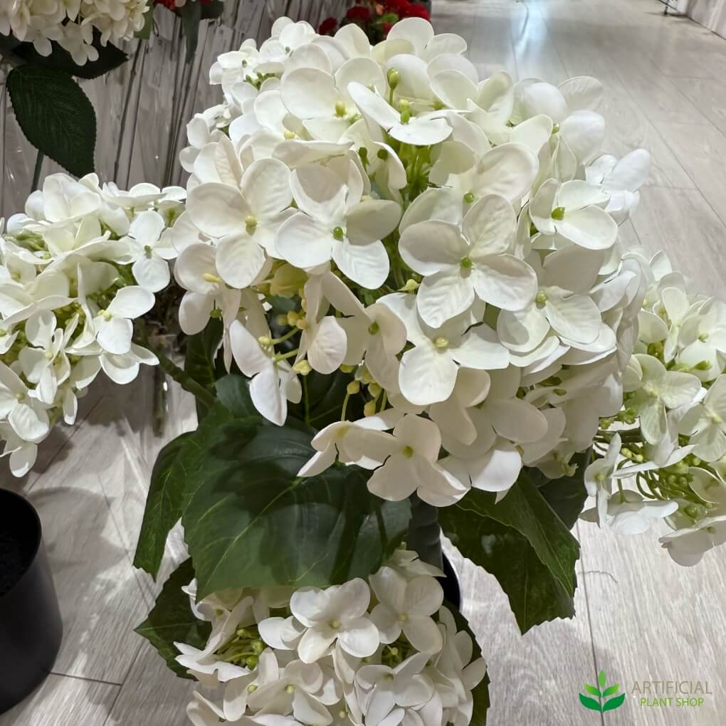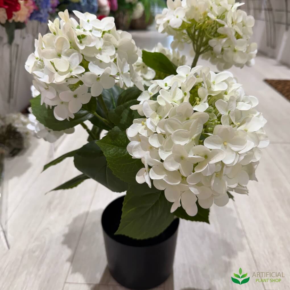 Bring some timeless elegance to your space with our artificial White Hydrangea Pot Plant. This beautiful artificial plant features clusters of delicate white hydrangea flowers, each petal crafted with attention to detail to replicate the real thing. The flowers are beautifully complemented with lush, lifelike green leaves. This faux Hydrangea comes potted in our standar black pot, ready for your to out into your planter box or pot.