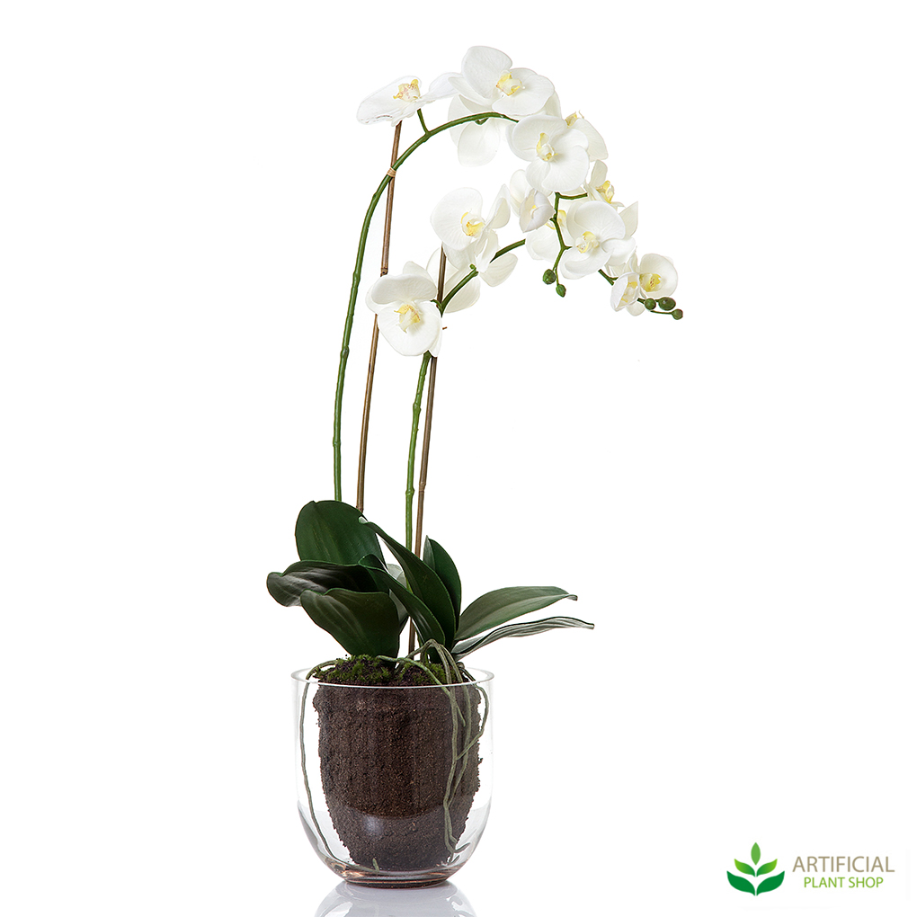 Tall and slender, this White Orchid comes paired with a glass vase. The Orchid is crafted with excellent attention to detail: rich green leaves, artificial soil, orchid roots and flowers in full bloom. Idea for placing in kitchen areas, living areas and office environments.